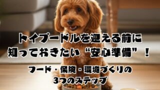 飼い主準備・お迎えガイドトイプードルを迎える前に知っておきたい“安心準備”!フード・保険・環境づくりの3つのステップ 見学の日、抱っこした瞬間に「この子と家族になりたい」と感じることがあります。でも、その温かな気持ちを「安心」へとつなぐためには、準備が大切。この記事では、プードルズハウスでの実体験をもとに、フード・保険・環境づくりの3つのステップをやさしく... 2025.10.16飼い主準備・お迎えガイド