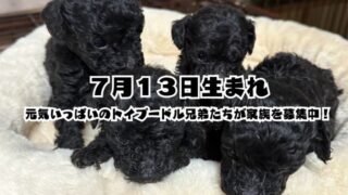 子犬紹介(家族募集専用)7月13日生まれ|元気いっぱいのトイプードル兄弟たちが家族を募集中! 7月13日生まれ、元気いっぱいのトイプードル兄弟たちが家族を募集中!7月13日生まれで、元気いっぱいのトイプードル兄弟たちが、プードルズハウスで家族を募集中!題して、7月13日生まれ|元気いっぱいのトイプードル兄弟たちが家族を募集中!ではどうぞ。 2025.10.05子犬紹介(家族募集専用)